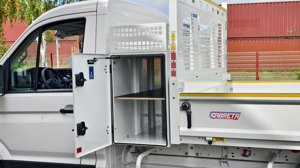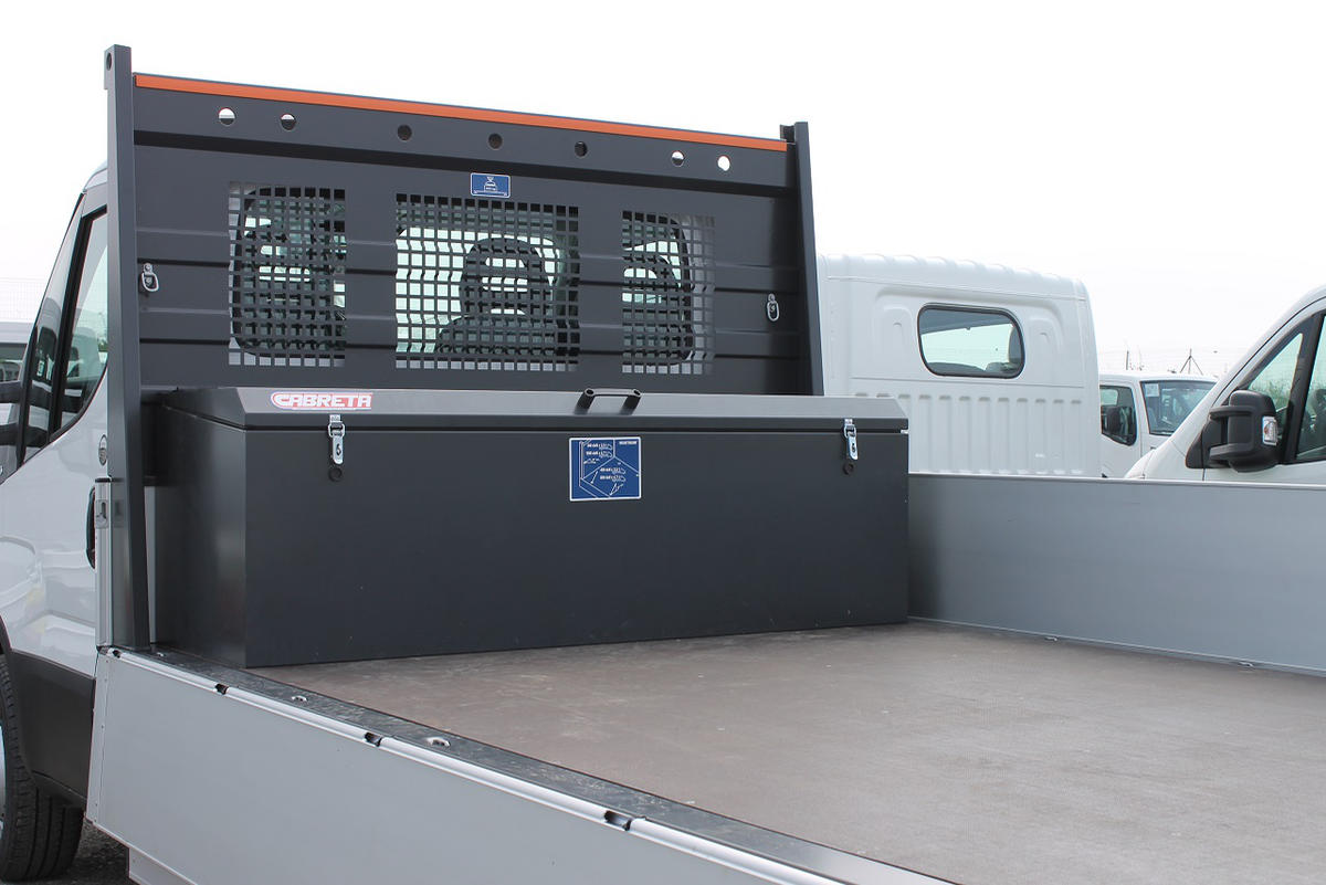 Le protège-cabine amovible est une exclusivité CABRETA en acier Z140 galvanisé à chaud ou aluminium d'épaisseur appropriée, avec une excellente résistance à la corrosion, pourvu de grandes ouvertures pour la visibilité du conducteur à l'arrière.