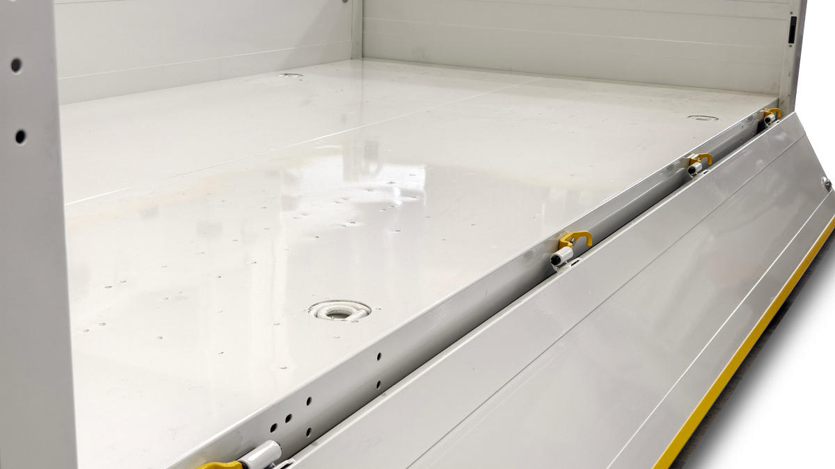 Les ridelles sont montées sur 4 gonds en acier et polymère chargé en fibre de verre afin d'éviter le frottement acier contre acier.